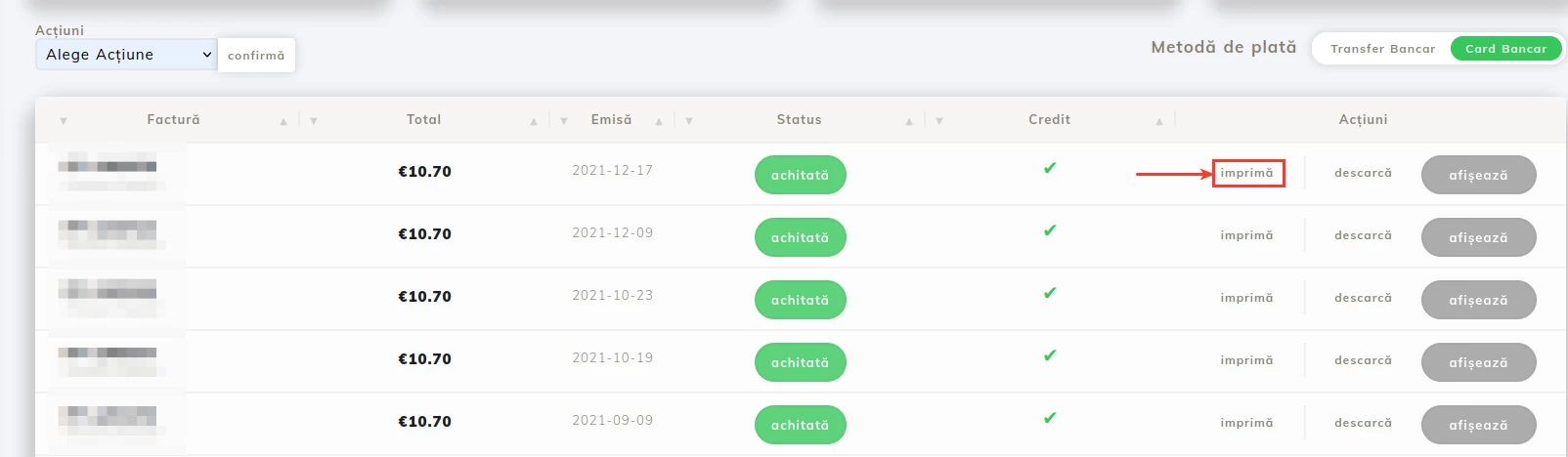 În dreptul facturii care se dorește a fi descărcată în RON se va face click pe Imprimă;