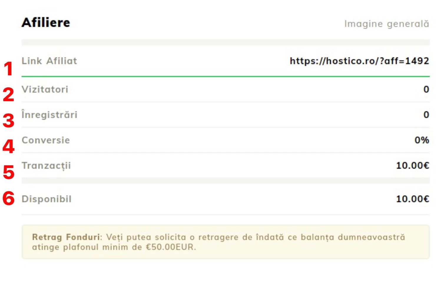 (1) Link Afiliat - portalul de plasare a comenzilor pentru aplicarea comisionului aferent; - (2) Vizitatori - numărul de vizitatori care au fost direcționați spre Hostico prin accesarea link-ului unic de afiliat;