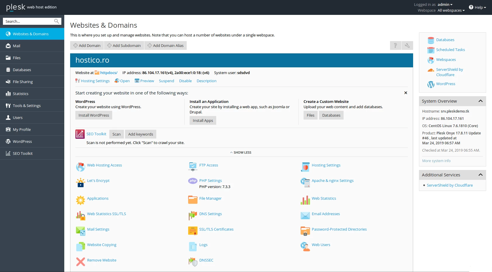 Interfața Plesk va fi aceeași indiferent de tipul de licență ales, diferența fiind dată doar de numărul de domenii care pot fi adăugate în panou.